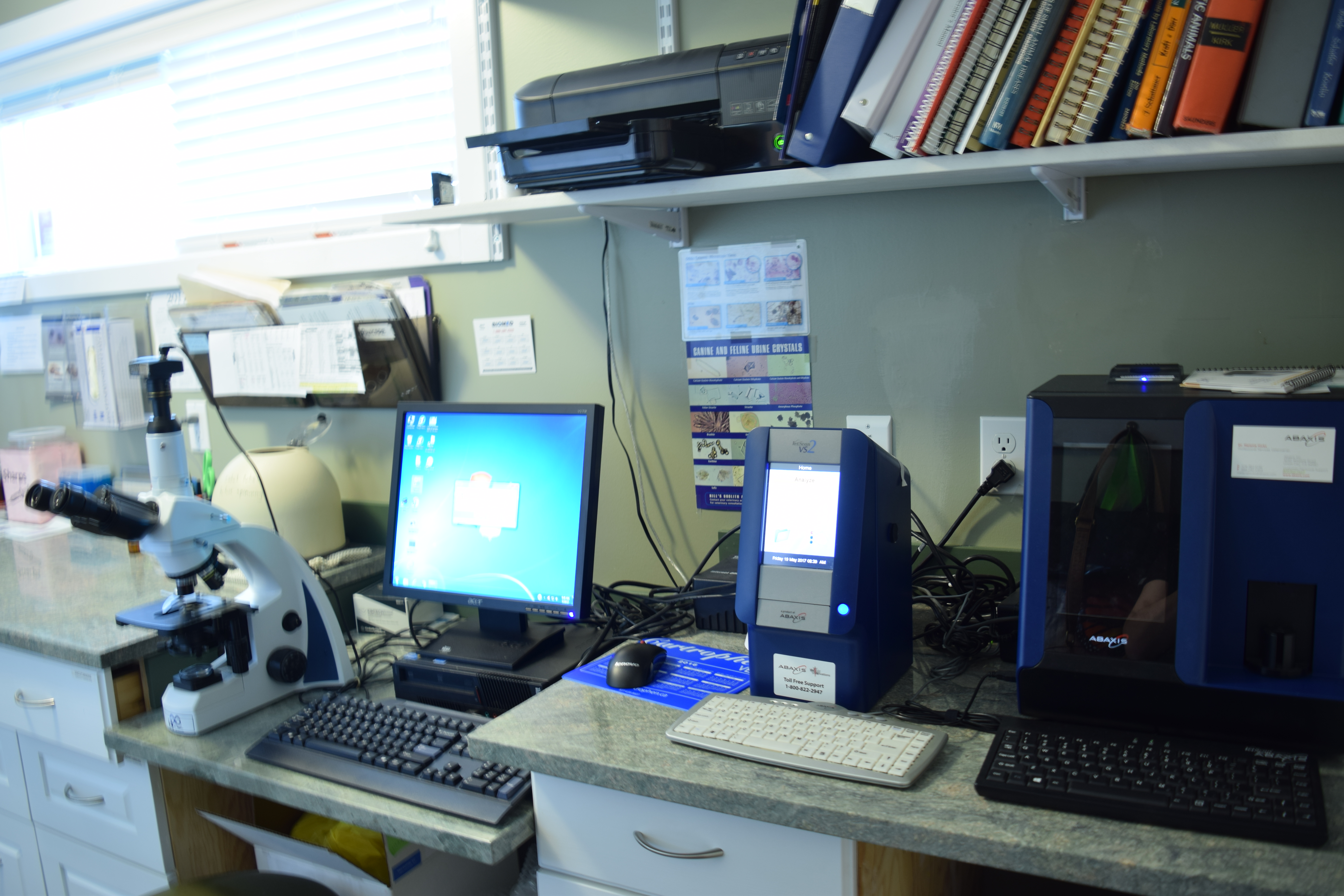 We have in house laboratory analysis machines which allow us to see the overall function and condition of your pets internal organs as well as the status of your pets immune system. Being able to run the urinalysis and bloodwork in clinic gives the veterinarians the results almost instantly, which overall, allows for safer anesthesia. These analyzers can also help with monitoring if your pet has a disease or illness.